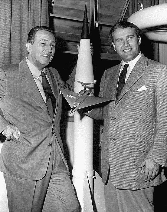 Walt Disney and Von Braun collaborated on a series of three educational films as shown in this 1954 photo.